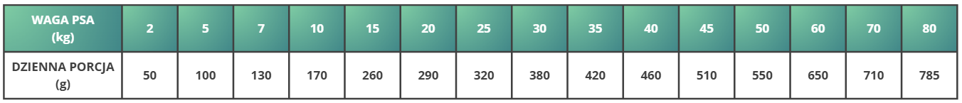 Każdy pies jest wyjątkowy i może mieć inne potrzeby żywieniowe zależne od wieku, poziomu aktywności i kondycji. Obserwuj swojego pupila i w razie potrzeby odpowiednio zwiększ lub zmniejsz dzienną porcję karmy.